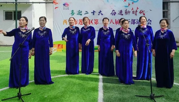 区老年大学学员演唱了《江山》《我们走在大路上》等歌曲,表达对党的热爱和美好祝福。