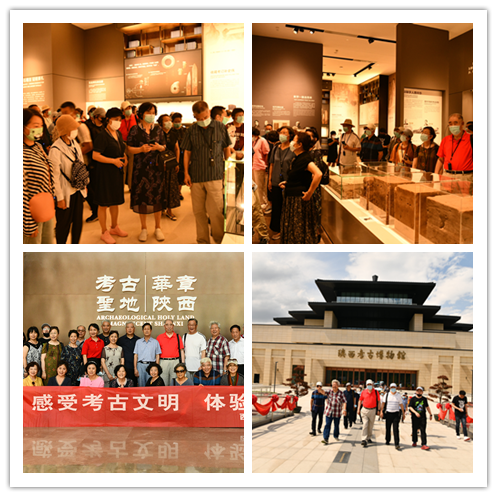 下午,采风组来到陕西考古博物馆。在讲解员的引导下,老同志们依次参观了“考古历程”“文化谱系”“考古发现”“文保科技”4个篇章。通过聆听馆藏文物简介及其出土背景、文化故事等,走近文物、走近考古,触摸历史,感知中华文明多元一体的总体特征。在“文保科技”展室,通过观看3D 投影,老同们体验了“堂中对坐图”“临行献酒壮行图”“醉归乐舞图”等墓主人生前的生活场景,直观地了解了展品背后的文保科技和文化内涵。