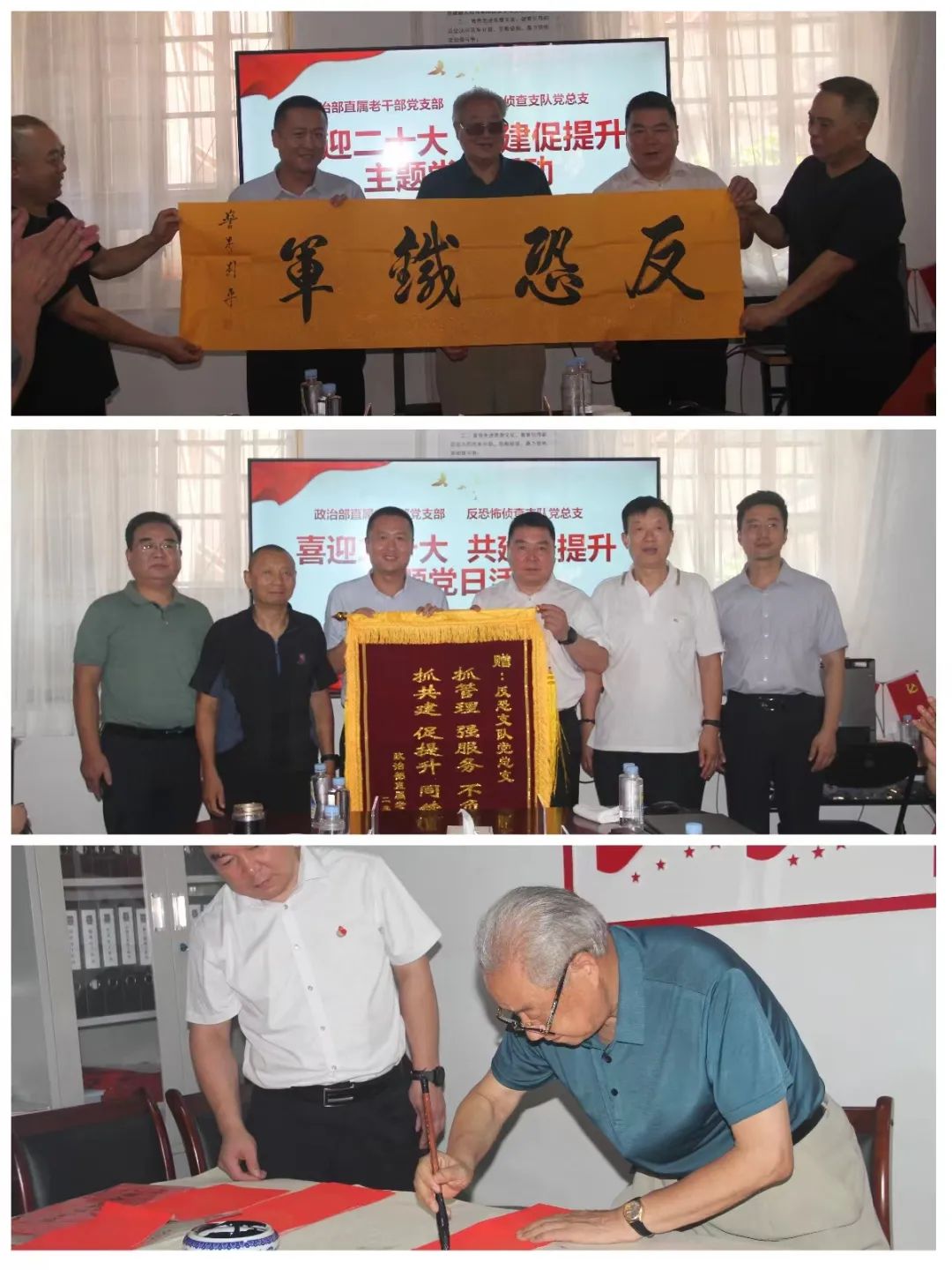 活动中,老同志为反恐支队赠送了书法作品,并现场挥毫为警营的年青战友点赞加油。老干部党支部与反恐支队党总支结成党建共建的对子,并向反恐支队党总支赠送了“抓管理、强服务、不负韶华,抓共建、促提升、同续新篇”锦旗。