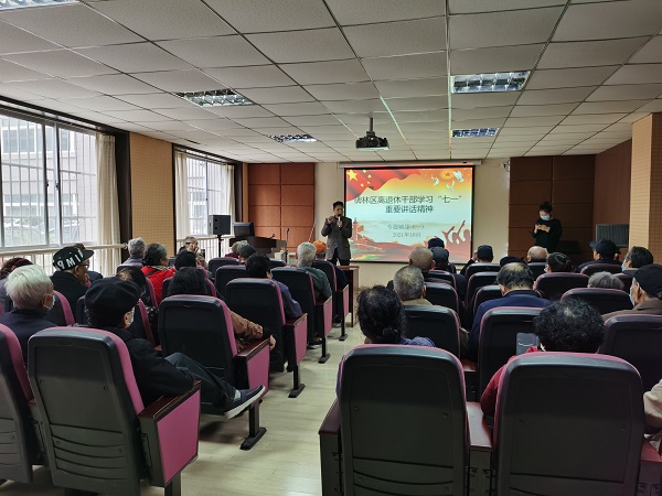 为进一步深入学习习近平总书记在庆祝中国共产党成立100周年大会上的重要讲话精神,领会重要意义、丰富内涵、核心要义和实践要求,引导广大离退休党员干部把思想和行动统一到习近平总书记重要讲话精神上来,以实际行动增强“四个意识”、坚定“四个自信”、做到“两个维护”,10月12日,碑林区委老干部局开展学习习近平总书记“七一”重要讲话精神专题辅导活动,全区离休及区级退休党员干部50余人参加。