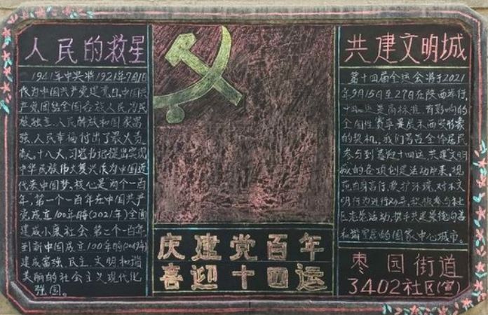 枣园街道3402社区退休党员高有富同志,以“庆建党百年喜迎十四运”为主题办黑板报,用传统的方式,宣传“十四运”,号召社区党员群众共建文明城,共襄全运盛会。