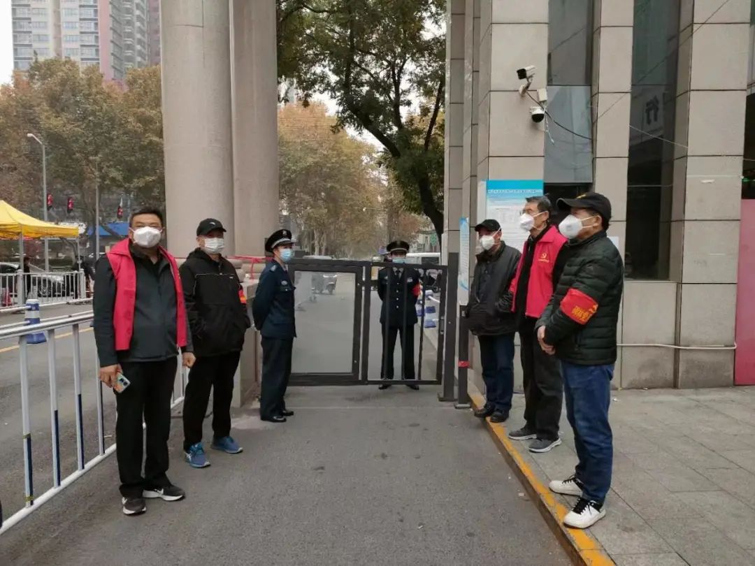 在铁一街南北口,三街北口,老同志们协助物业保安做好必要进出人员的登记,查验一码通,体温测量等工作,同时认真做好宣传和解释工作,助力物业守好居民小区“安全线”。