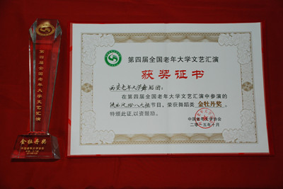 10月26—28日在河南三门峡市举办的第四届全国老年大学文艺汇演中,西安老年大学选送的舞蹈《陕西风俗八大怪》在全国60所老年大学选送的42个舞蹈节目脱颖而出,荣获金奖(金牡丹奖)。浓郁的三秦特色、热情的黄土风情、鲜丽的地域服饰,热情泼辣的古城风情,在西安老年大学学员的精彩表演下惟妙惟肖,精彩纷呈的展示给来自全国各地的朋友,博得了现场观众的一片喝彩、阵阵掌声。精彩的表演展示了西安市老年人积极向上、乐观热情的精神风貌和西安市老年教育办学的丰硕成果。