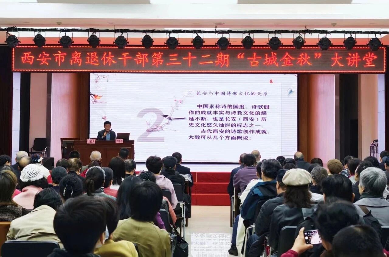 为了让离退休干部进一步了解唐诗文化、助力唐诗之都建设,10月20日上午,西安市老干部活动中心举办“唐诗与长安”诗词鉴赏专题讲座暨第三十二期“古城金秋大讲堂”,150余名老同志参加。