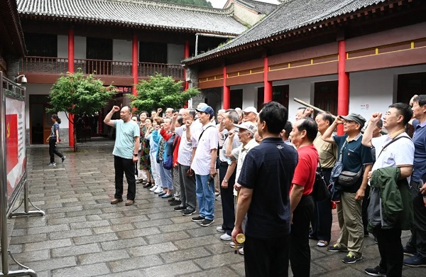 老党员们重走当年红军走过的道路,来到鄂豫陕苏维埃政府葛牌镇纪念馆,排好队列,佩戴党徽,面向鲜红的中国共产党党旗,庄严地举起右拳,重温入党誓词。
