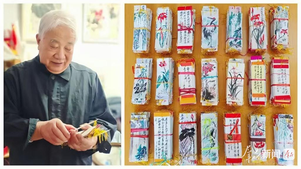 这些书签均出自85岁的退休教师樊西京之手。过去10余年,樊西京发挥书画特长,自购白色硬纸板裁剪成书签,每日伏案创作——正面誊写励志格言、警句,背面以水墨点染竹梅松石、花鸟鱼虫。