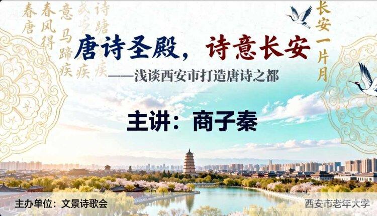 2025年12月27日上午,文景东区社区暖意融融、诗声朗朗,知名诗人、文化学者商子秦先生受西安老年大学文景诗歌会邀约,作了《唐诗圣殿,诗意长安》主题讲座,为近百名诗歌爱好者献上了一场精彩纷呈的文化盛宴。活动现场,主讲人妙语连珠,深入浅出;聆听者全神贯注,如痴如醉,生动诠释了“妙解”与“沉醉”的诗意回响。