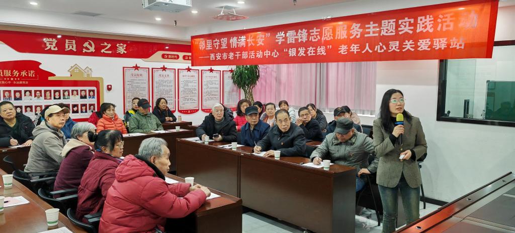 聚焦银龄关怀,传递服务温情。积极响应“银龄行动”号召,深度挖掘并充分发挥老干部的政治优势、经验优势与威望优势,以品牌化建设、常态化开展为志愿服务核心抓手,积极引导老干部发挥余热、奉献社会。锚定老年群体心灵需求,重点打造“银发在线”老年人心灵关爱驿站特色服务品牌,组建老干部银龄志愿者服务队,依托老干部亲和力足、人生阅历丰富、群众基础好的独特优势,主动下沉基层、对接需求,先后走进莲湖区桃园路第一中心社区、未央区文景东、西区等12个社区,开展形式多元、内容丰富的心灵关爱活动16场,累计服务老年人1000余人次,实现服务覆盖面与精准度双提升。