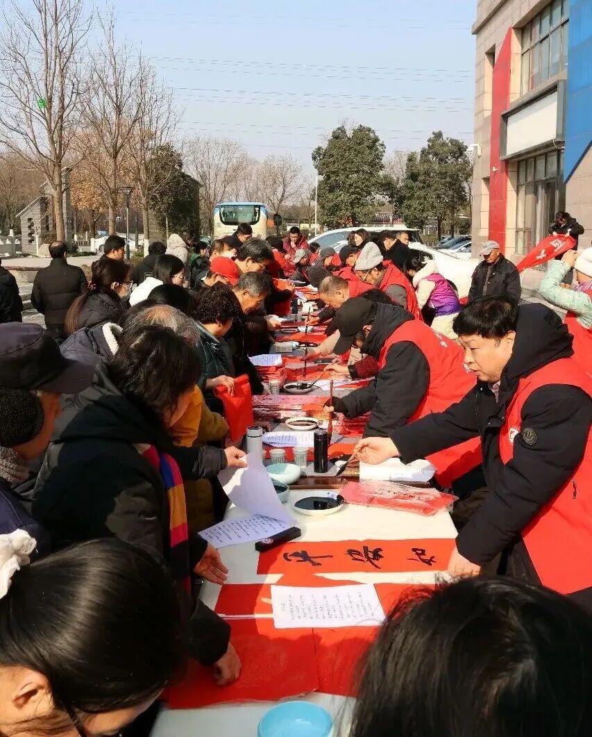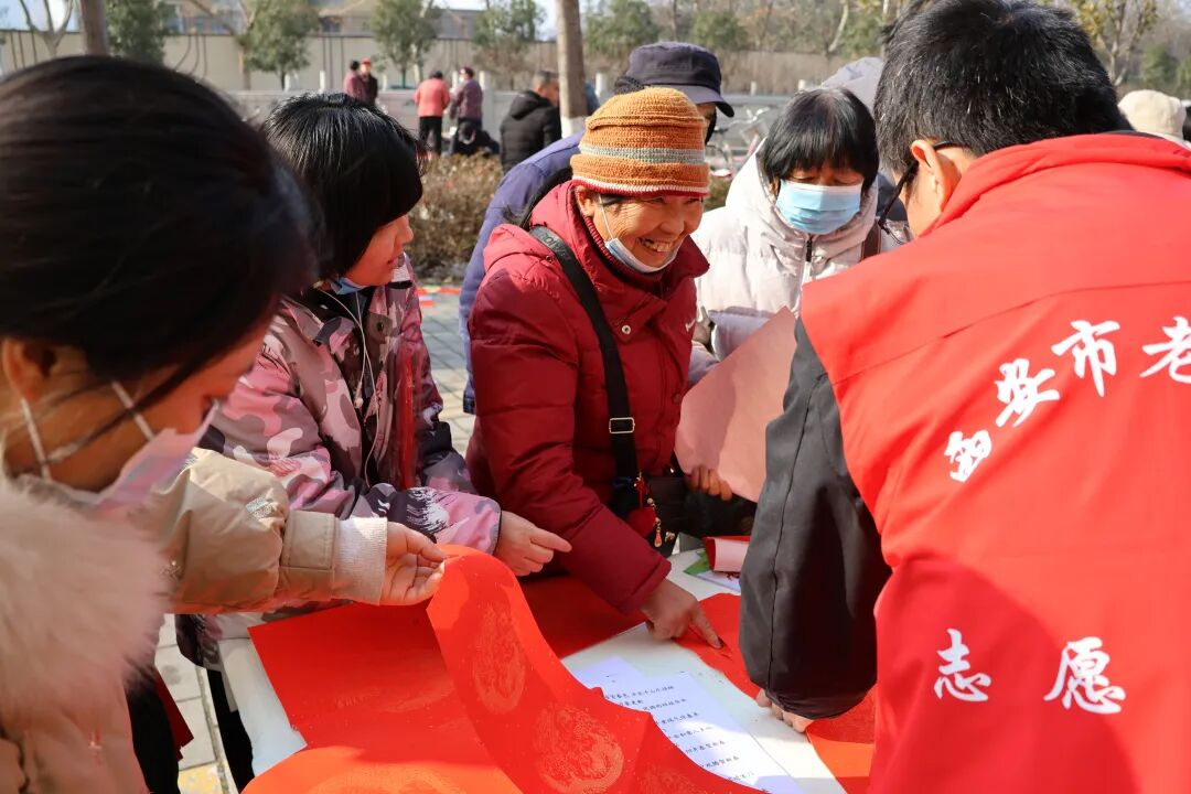 闻讯而来的社区居民围拢在书案旁,有的踮脚挑选心仪联句,有的静静欣赏笔墨风采,将写好的春联小心翼翼地折叠好捧在手里,仿佛捧着一份沉甸甸的年味。“书法家写的春联就是不一样!墨香扑鼻,看着就喜庆!”一位拿着春联的大爷冲着志愿者和中心的工作人员竖起了大拇指。现场红色的春联、福字铺满空地,映衬着一张张幸福的笑脸,汇成了一片欢乐祥和的红色海洋。