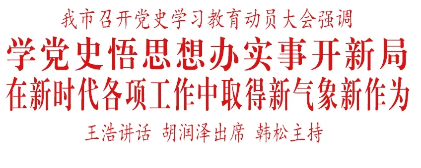 3月1日,我市召开党史学习教育动员大会。省委常委、市委书记王浩出席并讲话。他强调,要深入学习贯彻习近平总书记在党史学习教育动员大会上的重要讲话,高标准高质量开展好党史学习教育,引导广大党员更加坚定自觉增强“四个意识”、坚定“四个自信”、做到“两个维护”,努力在新时代各项工作中取得新气象新作为。