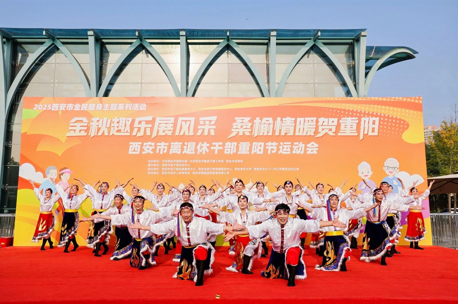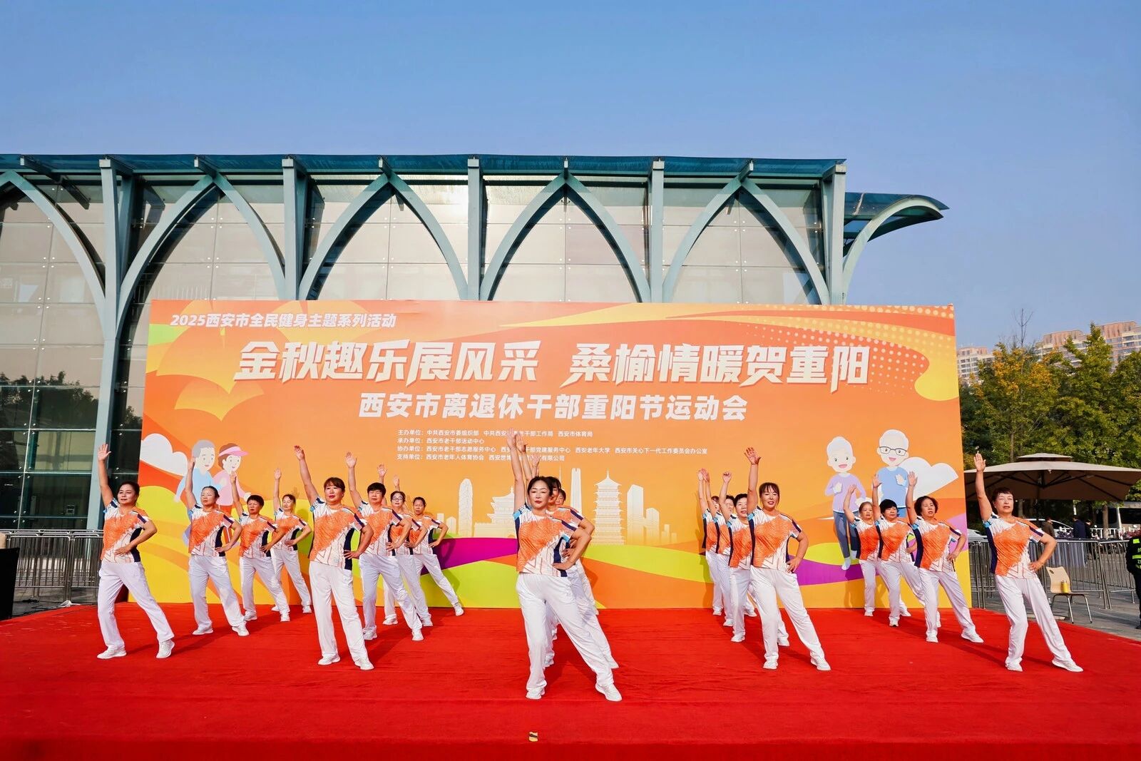 运动会在欢乐喜庆的氛围中拉开帷幕。西安老年大学的学员们表演了精彩纷呈的舞蹈和活力健身操。老同志们舞步轻盈、笑容灿烂,用饱满的热情和充满活力的身姿诠释了“桑榆未晚,霞尚满天”的豪情。