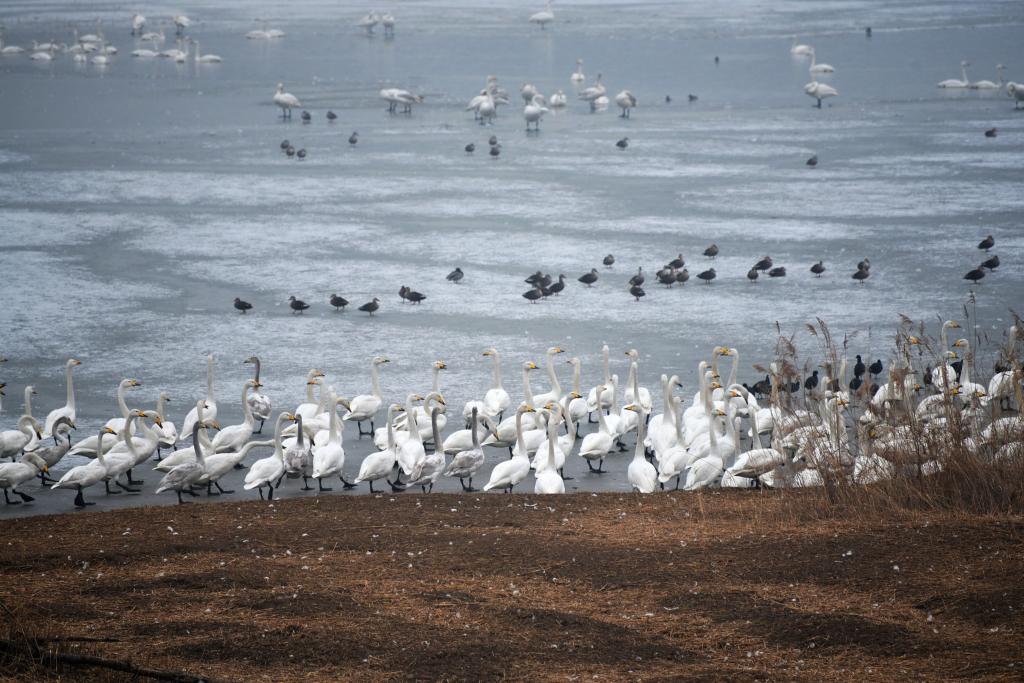 大天鹅好像对这些地方有记忆,可以看到一些大天鹅的脖子上戴有跟踪项圈和编号。给他们喂食的工作人员讲,有编号的大天鹅已在这里七年了,它们准时飞走又准时飞回来。看着欢快的大天鹅,它们不怕人类,对人很是亲近。听到喂食的哨声,一拥来到岸上的平地,争先恐后的吃玉米,吃饱了进入黄河里戏水追逐,度过欢快的一天,也引来众人到此一睹大天鹅的尊容。