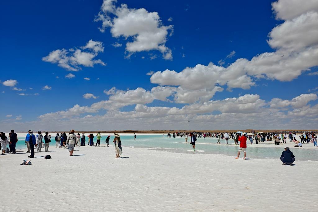 翡翠湖则由多个盐湖组成,因含盐量差异与光线折射,呈现出深浅不一的绿色,宛如散落戈壁的翡翠。孙子跟着奶奶乘小火车游览,我独自漫步盐滩,脚下盐粒晶莹,仿佛行走于水晶世界。