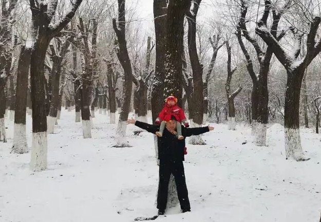 那个三岁的小孩子不知道什么时候又和爸爸妈妈来到了我身边,他的欢叫声将我从沉思中拉了回来。看着他漂亮的外套,卡通式的帽子,不由得内心欢喜。我问他爸爸妈妈,我可以抱着他照个像吗?他爸爸点了点头,对孩子说,爷爷说你很漂亮,和你照个像。我弯下腰来,把他架在我的脖子上,背后紧靠着大树,伸出双手,扶着他,摇着他,小家伙一下子“咯咯咯”地大笑起来。小家伙看到自己比爸爸妈妈还要高,嚷嚷声更大了,双脚更是高兴地来回蹬着。“咯咯咯”的笑声在偌大的树林间穿越着,在一片雪白的世界里回荡着,我突然间明白了一个道理:如果你向前一步,而我向后退一步,那么,我们俩看到的世界就是一样的了。